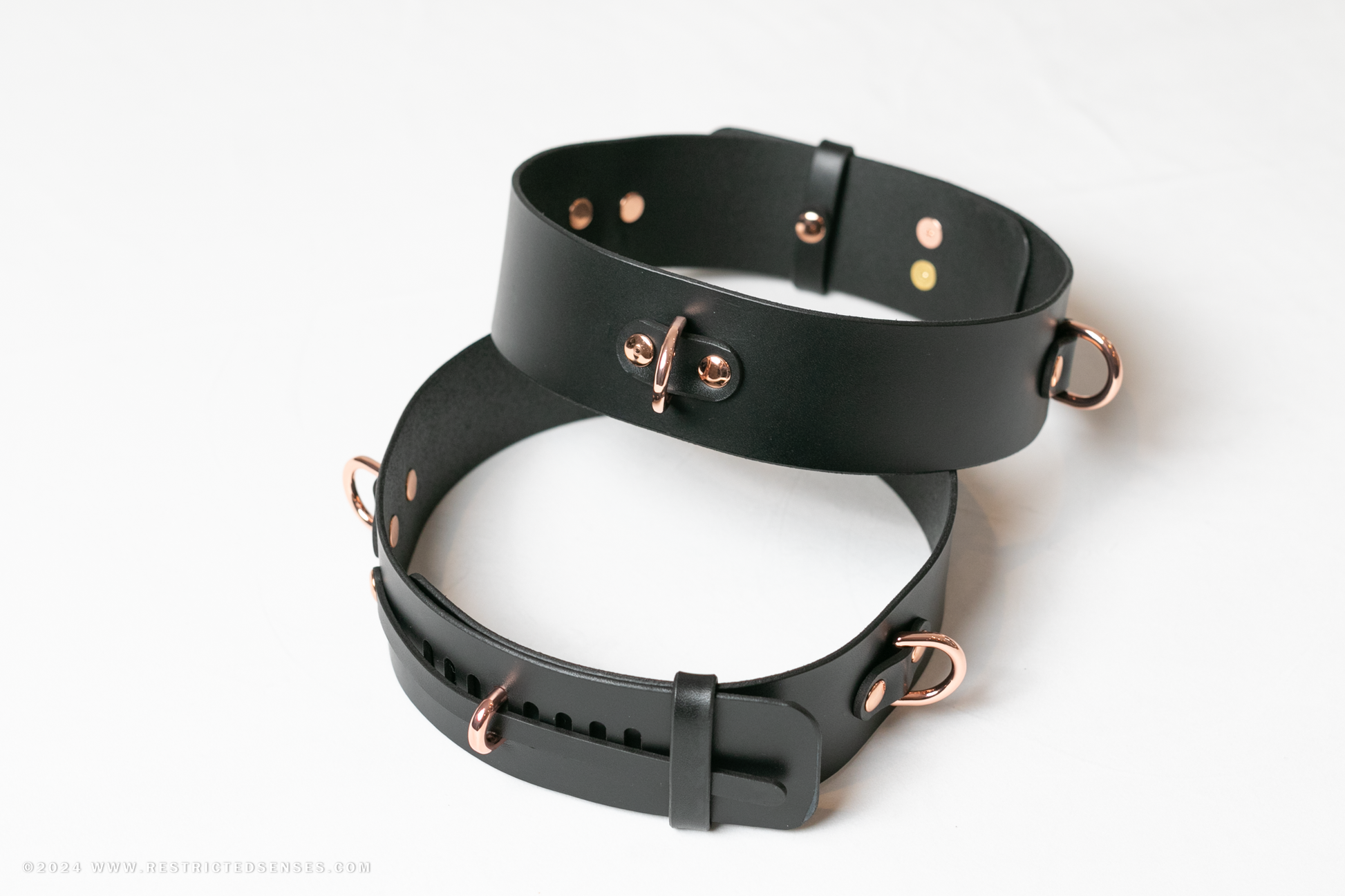 Locking Post Leather Thigh Cuffs available with Rose Gold and Silver Hardware, featuring 3 D-Rings for attachments.