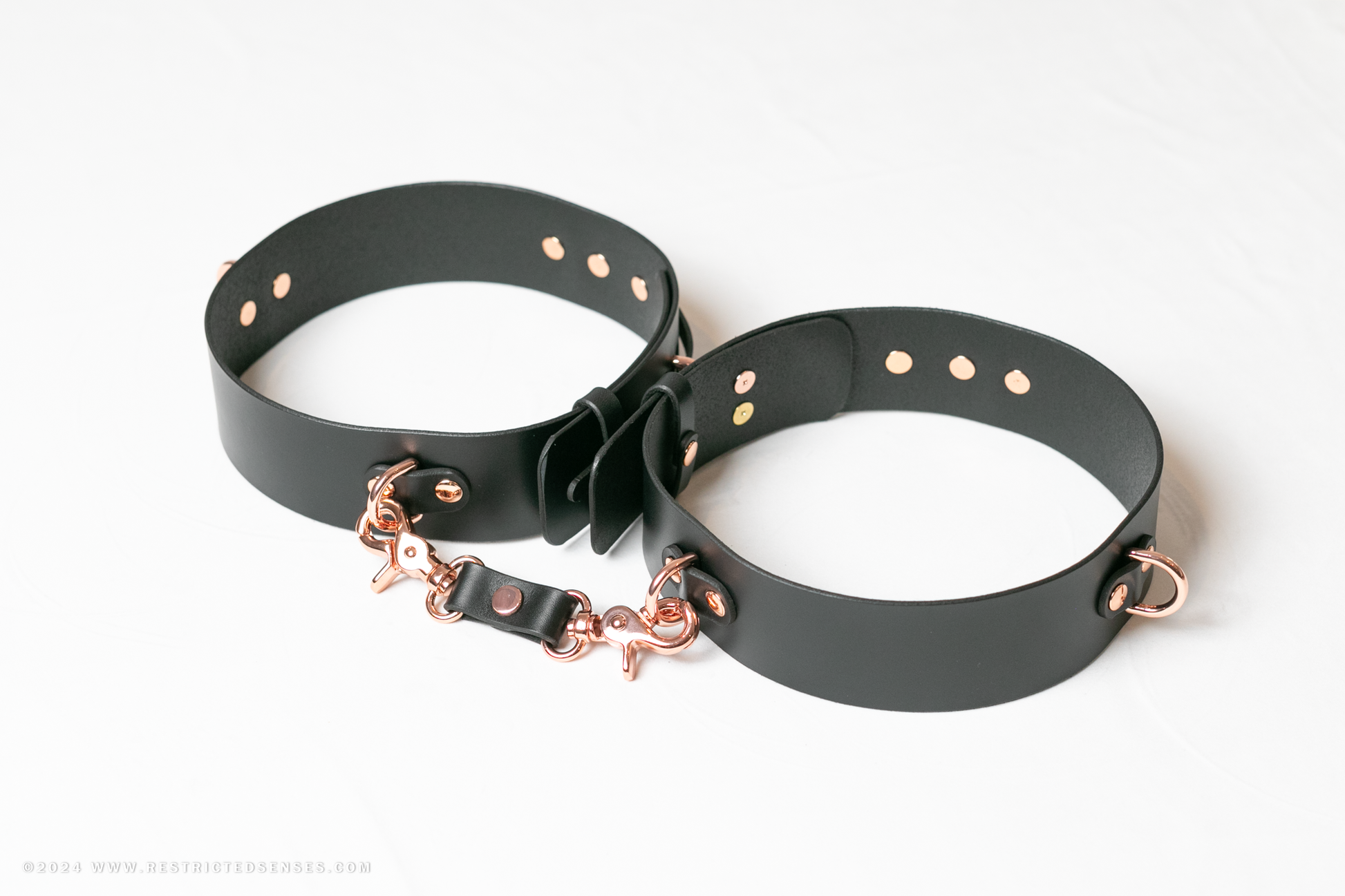 Our cuffs have the optional add-on of a 2 Way Snap Hook Connector which can be used to connect them. These can also be purchased separately in our other listings.