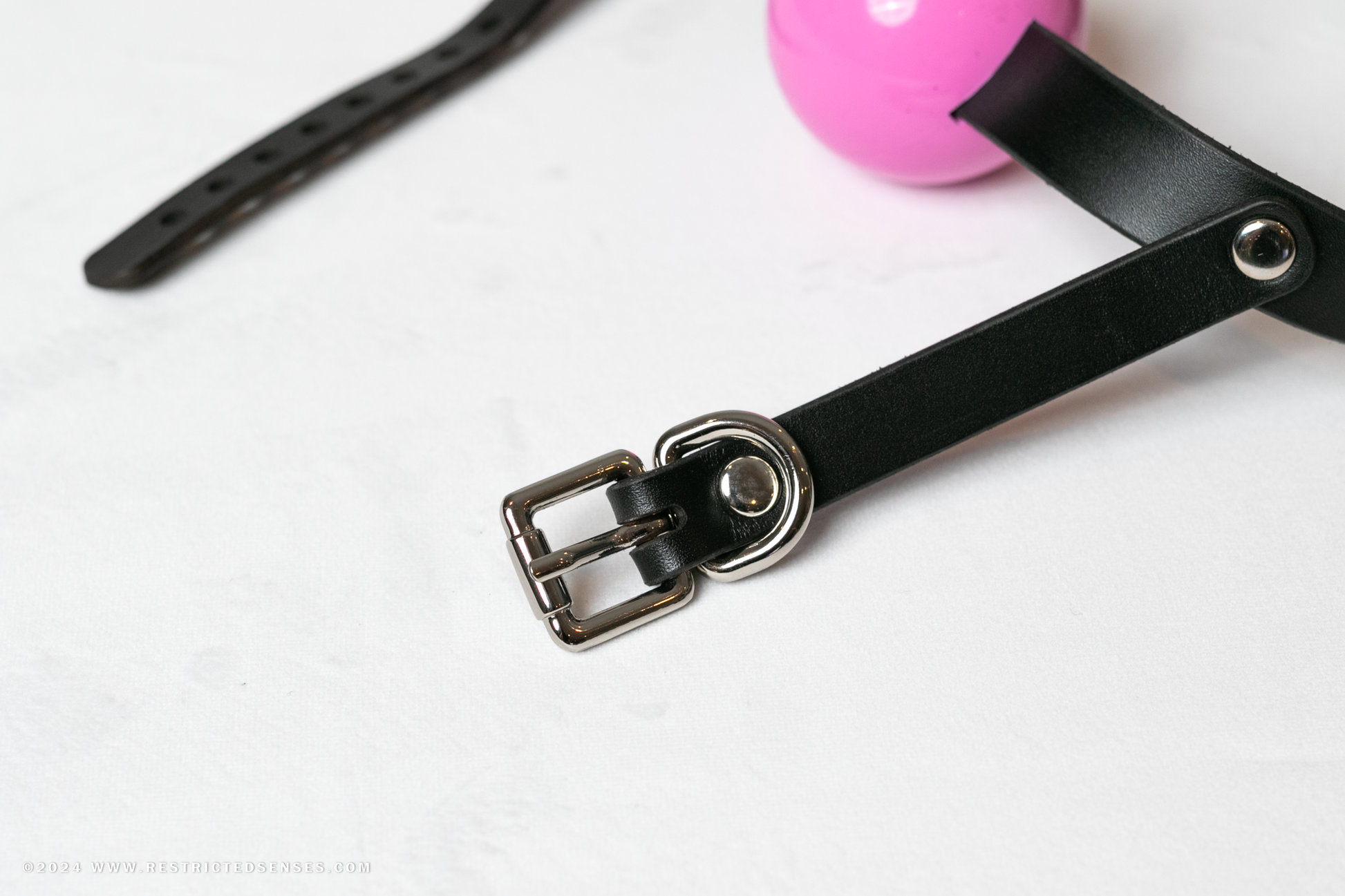 Leather Bondage Chin Strap Ball Gag. A simple chin strap ball gag is a great piece to add to your collection, slightly more restrictive than a single strap gag, a chin strap holds the ball more firmly in the mouth.
