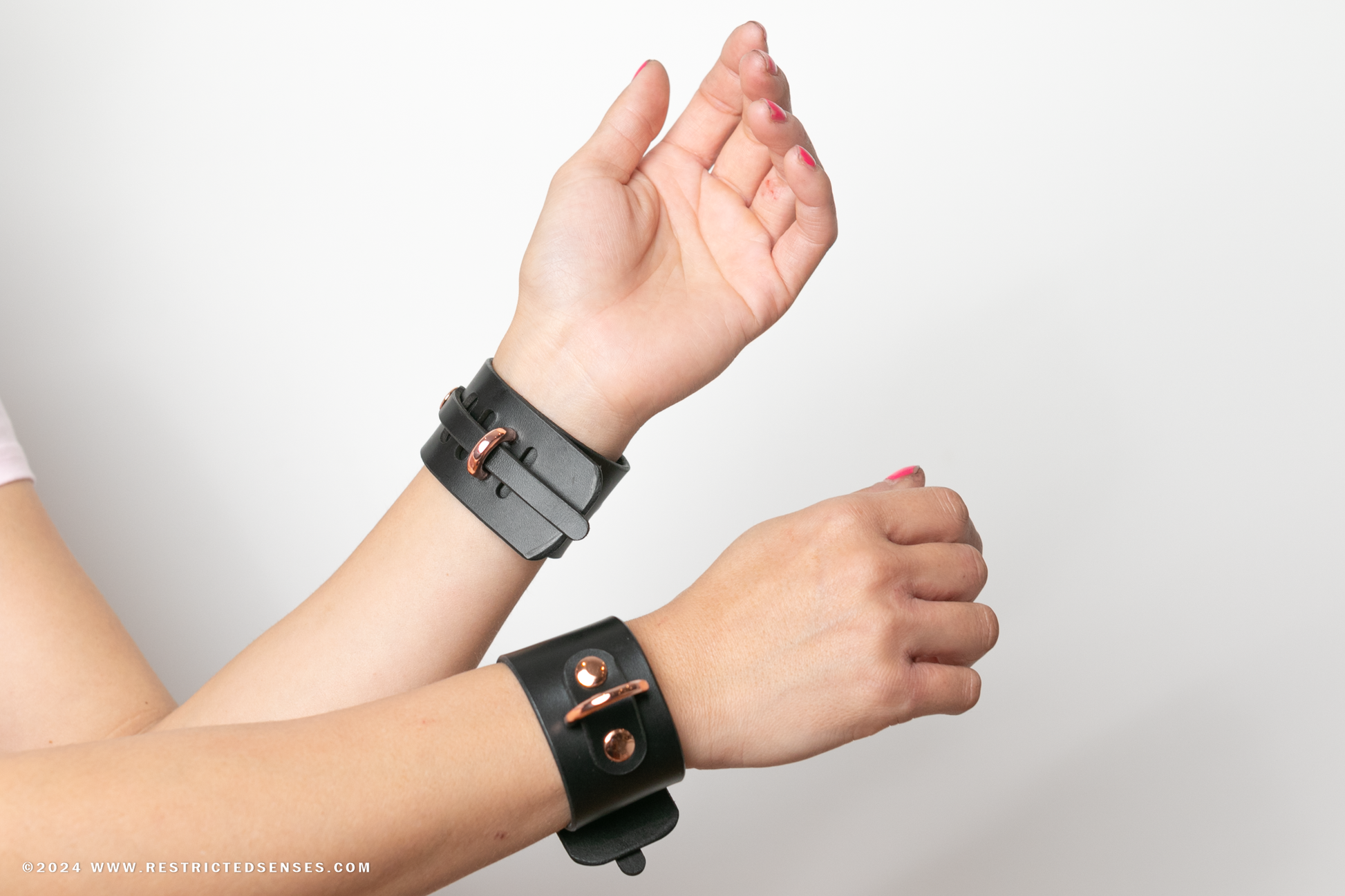 These precision Laser CNC cut Hand Cuffs are simple, elegant and low profile. The design makes for a lockable cuff via a padlock (not included), or securing the cuff via a strap which passes through the locking bridge and will stay put this way. A classic design, while also elegant and minimalist these cuffs are made from an approximately 2.2mm premium genuine Italian leather hide.