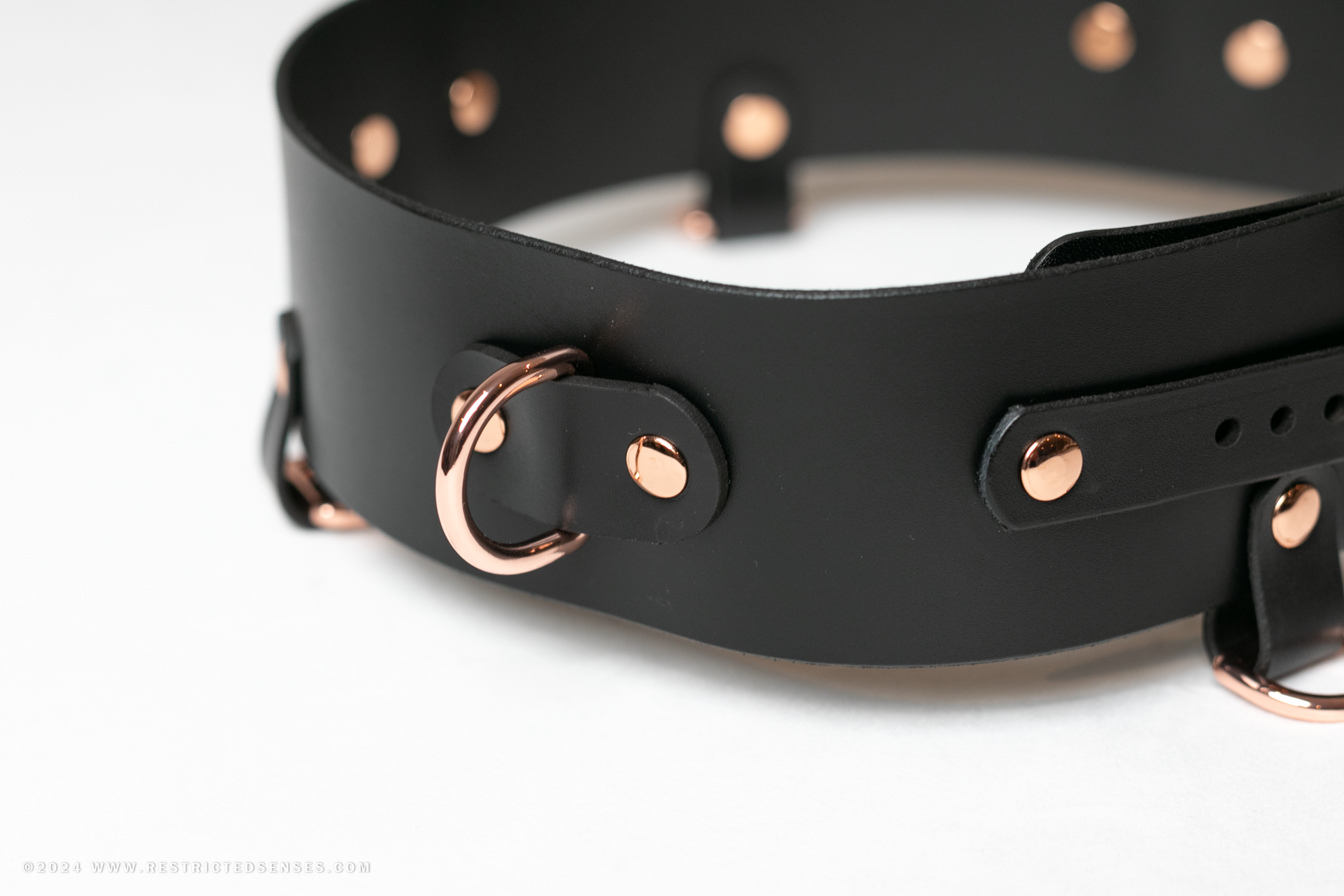 Premium Leather Bondage Belt available in Rose Gold and Silver Hardware. 3 x 25mm D-Rings and 4 x 19mm D-Rings make for many attachment and configuration possibilities.